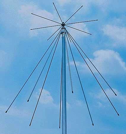 A discone antenna is a form of bi-conical antenna with spoke radiating both outward and downward in a circular pattern. The antenna is vertically polarized and extremely widebanded (meaning it will receive, and transmit, on a wide range of frequencies). The frequency range that a discone covers is dependent on the length of the individual spokes. The longer the spokes, the greater the frequency range. Some military discone antennas can have wire spokes tens of feet long to cover HF, VHF, and UHF frequencies.