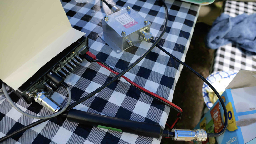 First off is to think of antennas and placement. At the campout this year, all my neighbors were running wire antennas, like end fed half waves and dipoles. Knowing that signal polarization can make a difference, I deployed a vertical antenna at my site. Polarization mismatch can attenuate a signal up to 20 dB in the near field, so that can knock out a big chunk of the noise.